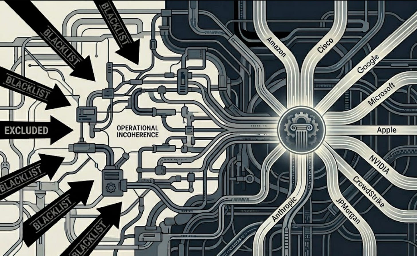 You cannot costlessly exclude what the system requires. That is the law this situation is demonstrating. The blacklist exists. The ban is technically in effect. The enforcement mechanism runs into the structural reality that Anthropic has been built into the security stack of every significant commercial technology company that also sells to the Pentagon. The DoD would need to sever ties with a wide range of vendors to actually enforce the exclusion.